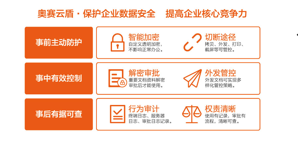 奧賽數(shù)據(jù)資產(chǎn)管理解決方案可以讓中佳華悅能夠?qū)崿F(xiàn)數(shù)據(jù)集中存儲(chǔ)、文件多重備份、文件安全加密、文檔外發(fā)管控等功能,有效地保護(hù)中佳華悅的專(zhuān)利、核心技術(shù)、研發(fā)成果,鞏固公司在行業(yè)里的競(jìng)爭(zhēng)力。同時(shí)數(shù)據(jù)高速共享、文件自動(dòng)同步、上網(wǎng)行為規(guī)范等功能可以提高公司的工作效率,給公司帶來(lái)更高的效益,降低人力成本。