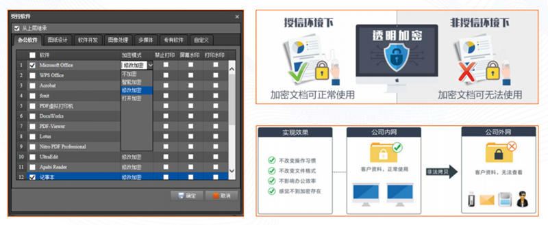 奧賽云柜的數(shù)據(jù)加密與加密可采用多樣化的靈活策略,可針對(duì)指定文檔格式進(jìn)行加密。解密外發(fā)可設(shè)置郵箱白名單(發(fā)送者白名單、接收者白名單),提高辦公對(duì)接效率。并可以通過(guò)手機(jī)App進(jìn)行在線查閱及解密,降低管理難度。