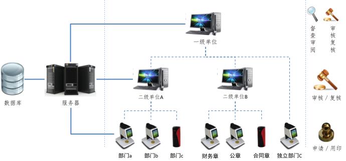 集團(tuán)公司對(duì)子公司智能公章管理系統(tǒng)示意圖如上所示。服務(wù)器端軟件部署到集團(tuán)專(zhuān)用機(jī)房或集團(tuán)私有云服務(wù)器。智能印章機(jī)部署于各個(gè)子公司或部門(mén),并有專(zhuān)人負(fù)責(zé)管理,總部業(yè)務(wù)部門(mén)專(zhuān)人負(fù)責(zé)用印審批和復(fù)核;集團(tuán)總部相應(yīng)部門(mén)負(fù)責(zé)遠(yuǎn)程督查審核,確保用印過(guò)程符合標(biāo)準(zhǔn)和要求,實(shí)現(xiàn)用印的“遠(yuǎn)程申請(qǐng)、遠(yuǎn)程授權(quán)、遠(yuǎn)程審批和遠(yuǎn)程監(jiān)督”。