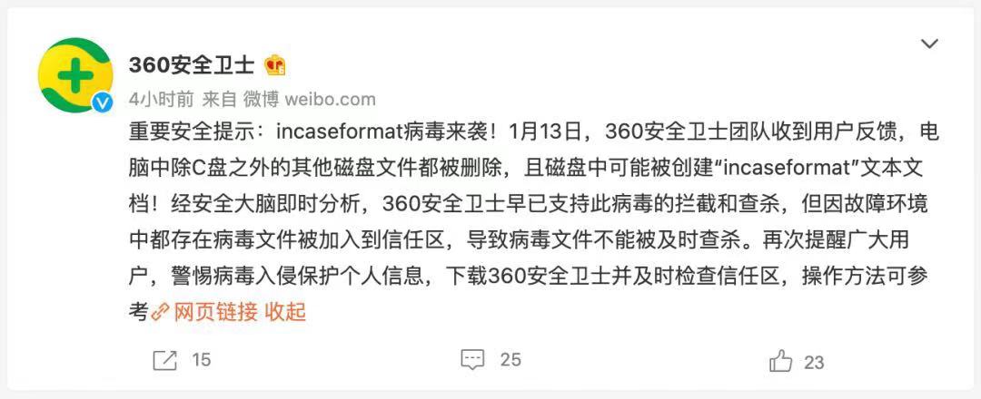 2021年1月13日,深信服、360、火絨安全實(shí)驗(yàn)室等國(guó)內(nèi)安全公司對(duì)外發(fā)布預(yù)警,稱一種名為incaseformat的蠕蟲病毒在國(guó)內(nèi)爆發(fā)。incaseformat病毒爆發(fā),涉及醫(yī)療、教育、運(yùn)營(yíng)商等多個(gè)行業(yè),且感染多為財(cái)務(wù)管理相關(guān)應(yīng)用系統(tǒng),感染表現(xiàn)為所有非系統(tǒng)分區(qū)文件均被刪除。