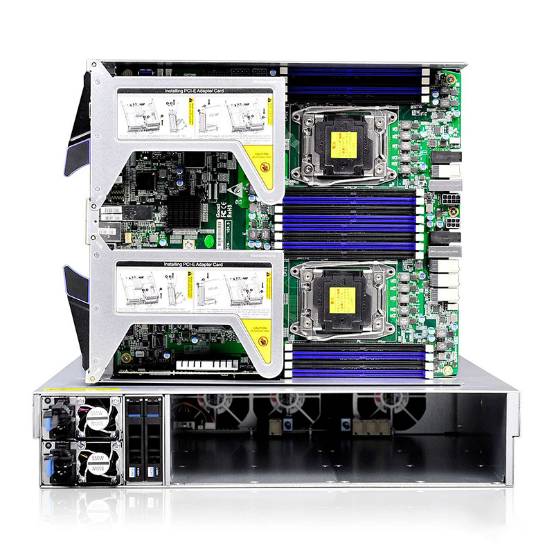在標(biāo)準(zhǔn)4U機(jī)架高度里部署1個(gè)雙路控制器,采用2顆并行排列的Intel? Xeon? E5-2600 V3/V4系列處理器,搭配1個(gè)內(nèi)置高速M(fèi).2 PCIE SSD。整機(jī)性能較傳統(tǒng)4U機(jī)架服務(wù)器系統(tǒng)提升數(shù)倍,適用于虛擬化桌面、大規(guī)模圖形渲染、云平臺等對空間、性能要求較高的大規(guī)模網(wǎng)絡(luò)應(yīng)用環(huán)境。